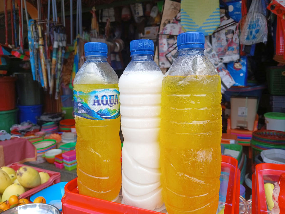 Pantauan Batam Pos, setiap lapak pedagang takjil di Pasar Tarempa, terdapat minuman se-perti air tahu, air kelapa dan lainnya yang dikemas ke dalam botol plastik bekas dengan berbagai macam merek, Minggu, (9/3).