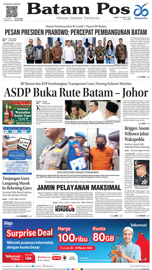 Silakan berlangganan untuk bisa membaca keseluruhan berita di Harian Batam Pos. ﹢ Berlangganan Baca Juga 3 Maret 2026 3 Maret 2026 WhatsAppTelegram 14 Maret 2025 14 Maret 2025 Buka konten iniDengan mendaftarkan diri Anda di Harian Batam Pos, Anda akan mendapatkan akses penuh ke seluruh konten.SubscribeKami tidak akan mengirimkan email yang tidak berkaitan dengan akun Anda.Saya setuju untuk memperoses data saya sesuai dengan Aturan Layanan yang disediakan.
