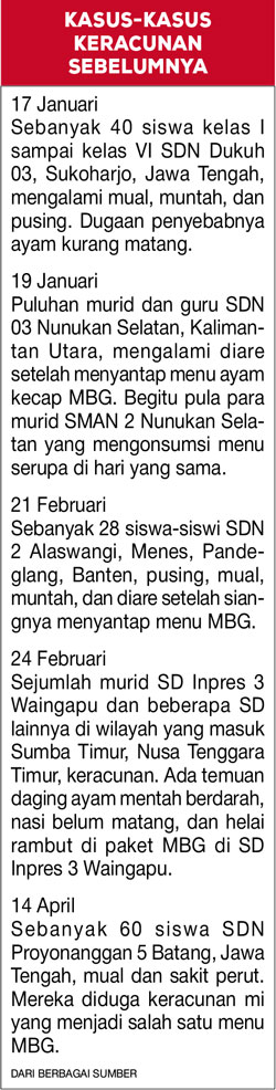 Dari seluruh pelajar yang mengalami keracunan, saat ini masih terbilang gejala ringan dan tengah dilakukan observasi oleh pihak rumah sakit. ”Tapi, nanti kita update lagi informasi terbaru untuk kondisi yang masuk dari pagi sampai siang (kemarin),” tuturnya. Sejak MBG diluncurkan pada 6 Januari, sudah berkali-kali kasus keracunan terjadi. Di berbagai daerah, lintas provinsi (lihat grafis).