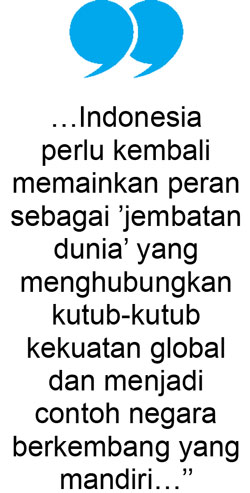 Sebagaimana pada era Konferensi Asia Afrika 1955, Indonesia hari ini juga perlu kembali memainkan peran sebagai ’’jembatan dunia’’ yang menghubungkan kutub-kutub kekuatan global, memperjuangkan keadilan, dan menjadi contoh negara berkembang yang mandiri, bermartabat, dan berdaya saing. (*)