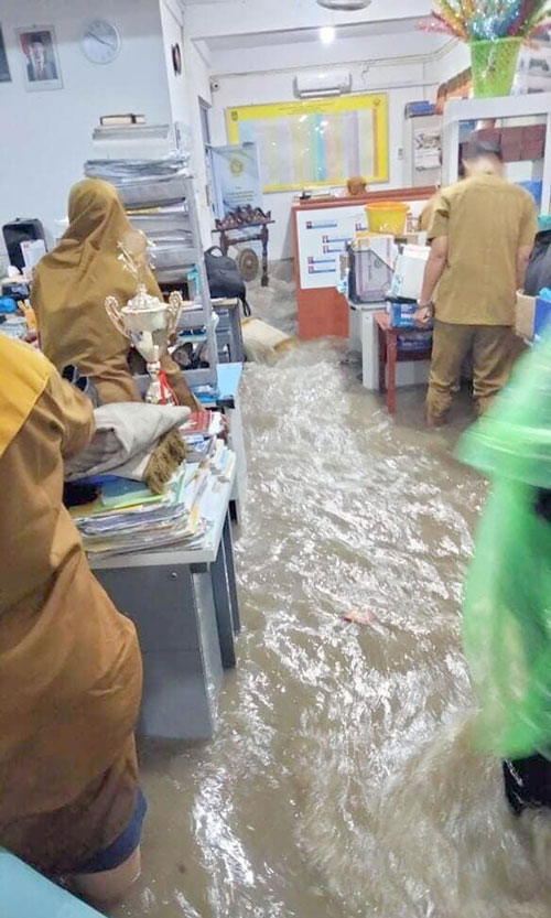 “Kalau hanya hujan sebentar biasanya tidak sampai masuk. Tapi kemarin hujannya sangat deras. Air dari parit depan sekolah meluap dan langsung masuk. Ini bukan yang pertama,” katanya.