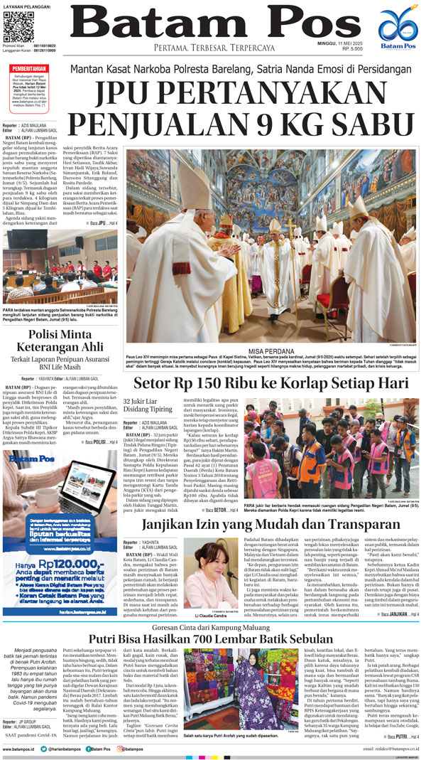 Silakan berlangganan untuk bisa membaca keseluruhan berita di Harian Batam Pos. ï¹¢ Berlangganan Baca Juga WhatsAppTelegram 11 Mei 2025 11 Mei 2025 Buka konten iniDengan mendaftarkan diri Anda di Harian Batam Pos, Anda akan mendapatkan akses penuh ke seluruh konten.SubscribeKami tidak akan mengirimkan email yang tidak berkaitan dengan akun Anda.Saya setuju untuk memperoses data saya sesuai dengan Aturan Layanan yang disediakan.