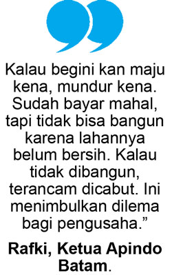 ”Uangnya sudah kami keluarkan. Puluhan miliar. Tapi tanahnya masih seperti itu, tak bisa kami sentuh,” kata seorang pengusaha yang meminta namanya disamarkan, kepada Batam Pos.
