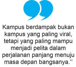 Kampus berdampak adalah hasil dari proses inovasi yang sadar kapasitas, disiplin dalam kuantifikasi ritme, dan terarah menuju garis tujuan bersama. Semua itu hanya mungkin terwujud jika ada orkestrasi pimpinan kampus. Kebangkitan kampus berdampak bukan sesuatu yang bisa diperoleh dengan slogan atau disulap lewat media. Kampus berdampak bukan yang paling viral, tetapi yang paling mampu menjadi pelita dalam perjalanan panjang menuju masa depan bangsanya. (*)