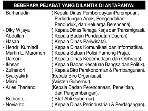 Ada pun para pejabat eselon dua yang dilantik tersebut antara lain Burhanudin sebagai Kepala Dinas Pemberdayaan Perempuan, Perlindungan Anak, Pengendalian Penduduk dan Keluarga Berencana. Kemudian Diky Wijaya selaku Kepala Dinas Tenaga Kerja dan Transmigrasi.