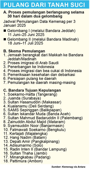 Pemulangan jemaah dibagi dalam dua gelombang. Gelombang pertama berlangsung dari 11 hingga 25 Juni. Itu terdiri dari 258 kloter yang berangkat melalui Bandara Jeddah dan delapan kloter dari Bandara Madinah. Sedangkan gelombang kedua dimulai 26 Juni–12 Juli 2025, dengan total 259 kloter yang diberangkatkan dari Madinah. (*)