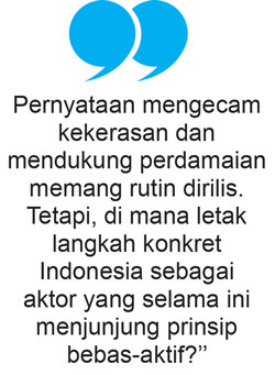 Di tengah situasi itu, posisi Indonesia kembali diuji. Sebagai negara dengan penduduk muslim terbesar di dunia dan salah satu kekuatan diplomasi di Global South, Indonesia tidak bisa sekadar menjadi penonton pasif. Namun, belakangan, diplomasi Indonesia terlihat gamang. Pernyataan mengecam kekerasan dan mendukung perdamaian memang rutin dirilis. Tetapi, di mana letak langkah konkret Indonesia sebagai aktor yang selama ini menjunjung prinsip bebas-aktif?
