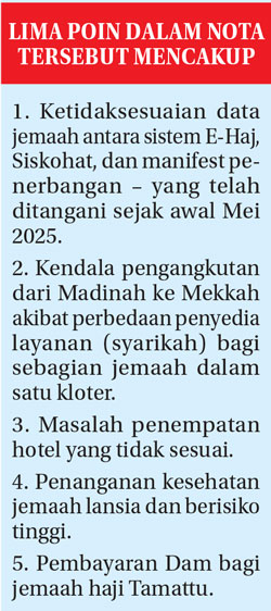 ”Nota diplomatik yang berisi lima poin itu sebenarnya sudah lama dan telah ditindaklanjuti oleh Pemerintah. Jadi, saat pelaksanaan haji tahun ini, semua persoalan itu sudah terselesaikan,” ujar Puan di Kompleks Parlemen, Senayan, Selasa (24/6).