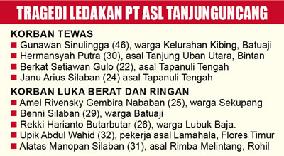 LEDAKAN hebat disertai kobaran api terjadi di sebuah kapal yang tengah diperbaiki di kawasan galangan PT ASL, Tanjunguncang, Batuaji, Selasa (24/6) sekitar pukul 14.15. Insiden itu menewaskan empat orang pekerja dan menyebabkan empat lainnya mengalami luka bakar serius, serta seorang luka ringan.
