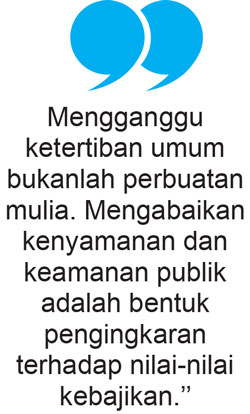 Perlu diingat bahwa hidup dalam masyarakat menuntut kesadaran akan kepentingan kolektif. Tidak boleh ada individu atau kelompok yang memaksakan kesenangannya dengan mengorbankan kenyamanan orang lain.