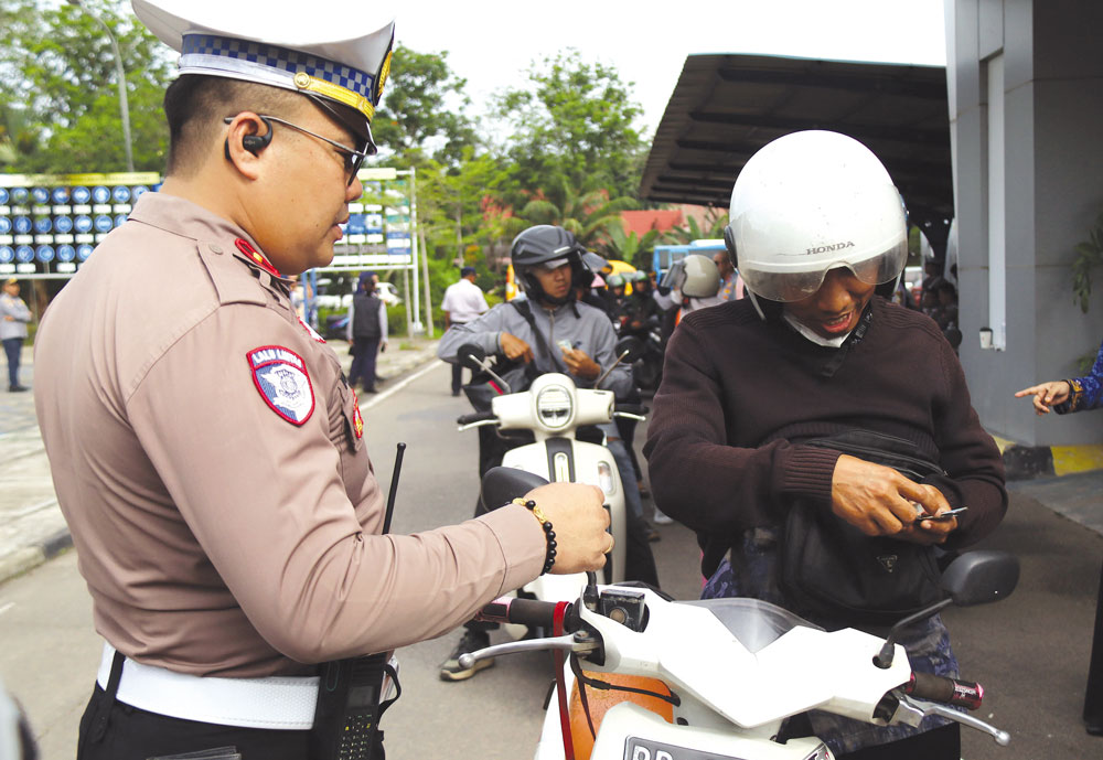 Petugas Kepolisian memeriksa kelengkapan surat-surat kendaraan warga saat terjaring razia gabungan yang dilaksanakan Ditlantas Polda Kepri, BPTD Kepri, Satlantas Polresta Barelang, Jasa Raharja, Dishub Kota Batam, dan UPTD PPD Batam Center di depan Kantor Dishub Batam, Kamis (17/7). Berita selengkapnya di halaman 13 Metropolis. F. Cecep Mulyana/Batam Pos