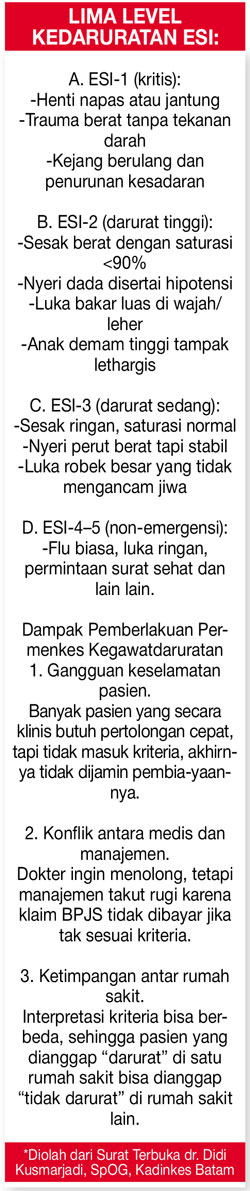 Di Surat Terbuka itu, Didi juga mengungkapkan, Permenkes tentang kegawatdaruratan menjadi rujukan utama rumah sakit dan BPJS Kesehatan. Namun, kriteria yang dipakai dinilai terlalu sempit dan tidak kontekstual. Keluhan seperti sesak ringan, nyeri hebat, atau pucat akibat perdarahan lambat, kerap tak dianggap darurat karena tak disebut secara eksplisit dalam aturan.