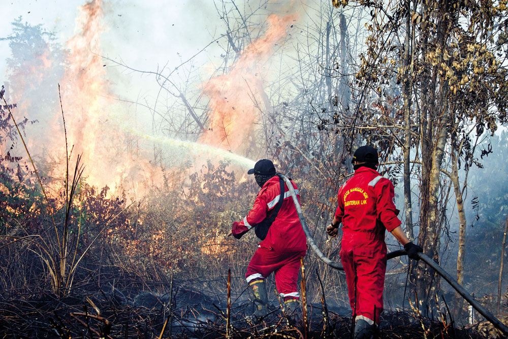 Petugas pemadam kebakaran berupaya memadamkan kebakaran hutan yang membakar lahan gambut di Rimba Panjang, Provinsi Riau, Minggu (20/7). Hampir setahun sekali, kebakaran lahan gambut terjadi di Riau. F. Wahyudi/AFP