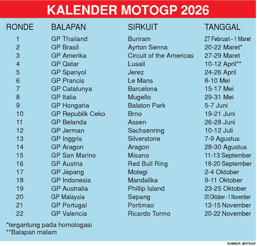 MADRID (BP) – MotoGP resmi mengumumkan kalender musim 2026 pada Kamis (24/7). Sama seperti musim ini, akan ada 22 seri balapan yang berlangsung. Bedanya, satu seri balapan yakni Argentina akan diganti dengan Brasil.
