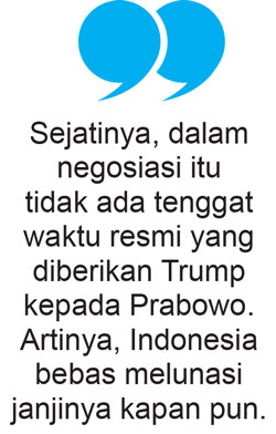 Sejatinya, dalam negosiasi itu tidak ada tenggat waktu resmi yang diberikan Trump kepada Prabowo. Artinya, Indonesia bebas melunasi janjinya kapan pun.