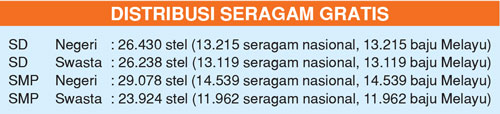 Seragam yang dibagikan terdiri atas dua jenis, yakni seragam nasional dan seragam khas daerah berupa baju Melayu. Siswa kelas 1 SD akan menerima seragam merah putih, sementara siswa kelas 7 SMP akan mendapatkan seragam putih biru.