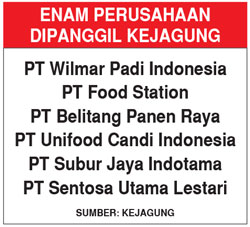 Keenam perusahaan tersebut, lanjutnya, diperiksa untuk memastikan ada atau tidak adanya tindak pidana korupsi dalam dugaan pengoplosan beras tersebut. ”Kami dalami dalam pengoplosan beras ini apa masuk ranah pidana umum atau pidana korupsi,” terangnya.