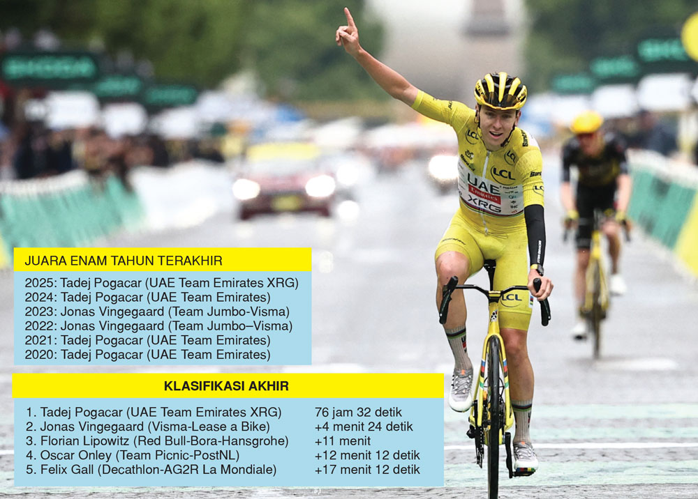 PARIS (BP) – Tadej Pogacar (UAE Team Emirates XRG) memastikan gelar juara Tour de France kali keempat atau juara secara back-to-back, Senin (28/7). Pembalap 26 tahun berkebangsaan Slovenia itu berhasil menjaga keunggulan lebih dari empat menit dari rival terdekatnya, Jonas Vingegaard, dari tim Visma-Lease a Bike.