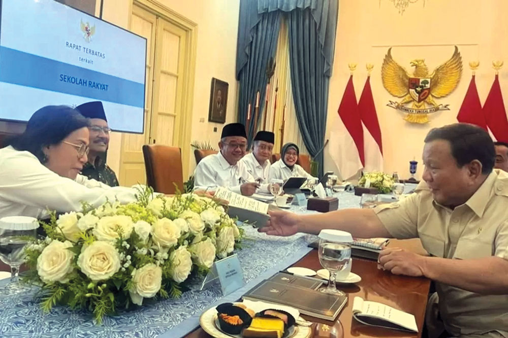 JAKARTA (BP) – Dalam rapat kabinet yang berlangsung pada Selasa malam, 29 Juli 2025, di Istana Kepresidenan, Presiden Prabowo Subianto secara spontan melihat buku catatan milik Menteri Keuangan Sri Mulyani Indrawati. Agenda rapat tersebut membahas program Sekolah Rakyat Merah Putih.