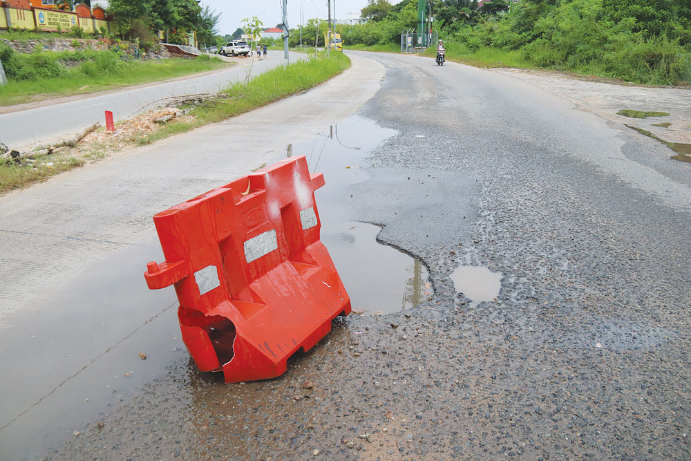 Lubang di Jalan Pemuda, tepat di depan SMKN 2 Batam Kota, diberi warga pembatas jalan atau barrier agar tak dilindas pengendara saat melintas di ruas jalan tersebut, Senin (4/8). Kerusakan jalan di kawasan tersebut sudah lama terjadi namun belum ada perbaikan. F. Cecep Mulyana/Batam Pos