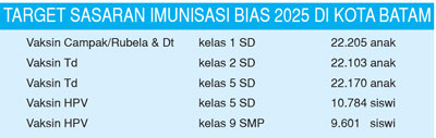 BATAM (BP) – Dinas Kesehatan (Dinkes) Kota Batam menargetkan 76.079 anak mendapatkan imunisasi selama Bulan Imunisasi Anak Sekolah (BIAS) 2025. Program nasional ini berlangsung sepanjang Agustus dan akan dilanjutkan dengan sweeping atau penjangkauan ulang pada September bagi anak-anak yang belum sempat diimunisasi.