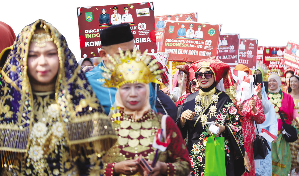 Peserta pawai budaya tampak antusias mengikuti parade dengan mengenakan pakaian adat daerah nusantara saat mengikuti Pawai Pembangunan 2025 di Jalan Ahmad Yani, Batam Center, Minggu (10/8). Peserta pawai ini terdiri dari pegawai pemerintah, swasta, hingga masyarakat umum. Selain pawai budaya, pada waktu yang sama Pemerintah Kota Batam juga menggelar pawai kendaraan hias sebagai rangkaian peringatan HUT Kemerdekaan ke-80 RI. F. Cecep Mulyana/Batam Pos