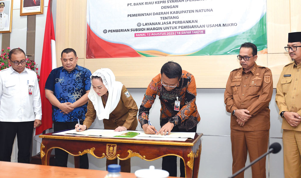 PT Bank Riau Kepri Syariah (Perseroda) bersama Pemerintah Kabupaten (Pemkab) Natuna menandatangani Memorandum of Understanding (MoU) terkait layanan jasa perbankan, serta Perjanjian Kerja Sama (PKS) dengan Dinas Perindustrian dan Perdagangan Kabupaten Natuna terkait subsidi margin pembiayaan usaha mikro.