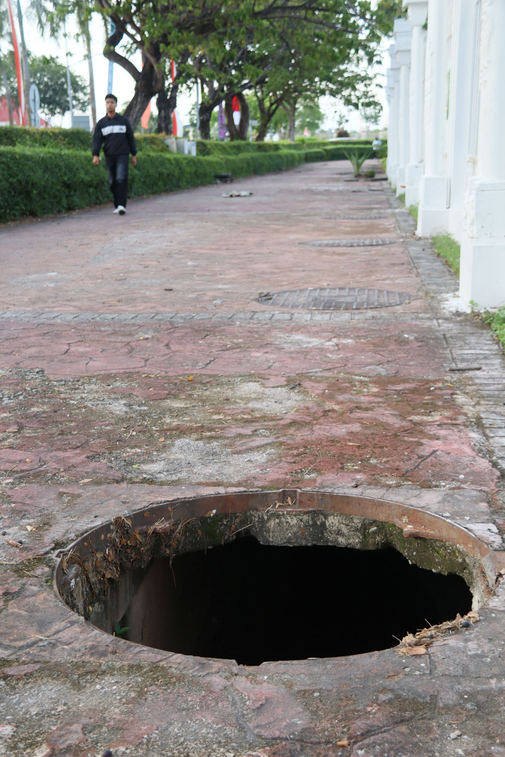 Saluran air di trotoar area luar Dataran Engku Putri, Batam Center, tampak terbuka tanpa penutup, Rabu (13/8). Padahal, trotoar ini kerap digunakan warga untuk berjalan kaki maupun joging. Kondisi tersebut perlu segera diperbaiki agar tidak membahayakan pengguna jalan. F. Cecep Mulyana/Batam Pos