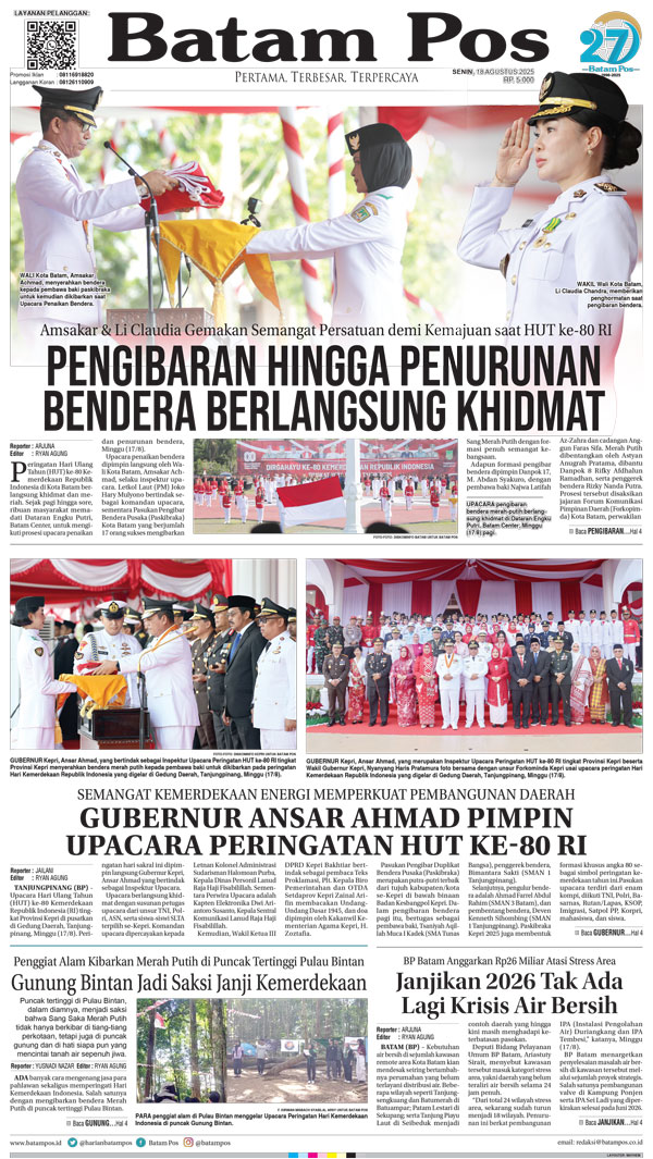 Silakan berlangganan untuk bisa membaca keseluruhan berita di Harian Batam Pos. ﹢ Berlangganan Baca Juga WhatsAppTelegram 18 Agustus 2025 18 Agustus 2025 Buka konten iniDengan mendaftarkan diri Anda di Harian Batam Pos, Anda akan mendapatkan akses penuh ke seluruh konten.SubscribeKami tidak akan mengirimkan email yang tidak berkaitan dengan akun Anda.Saya setuju untuk memperoses data saya sesuai dengan Aturan Layanan yang disediakan.