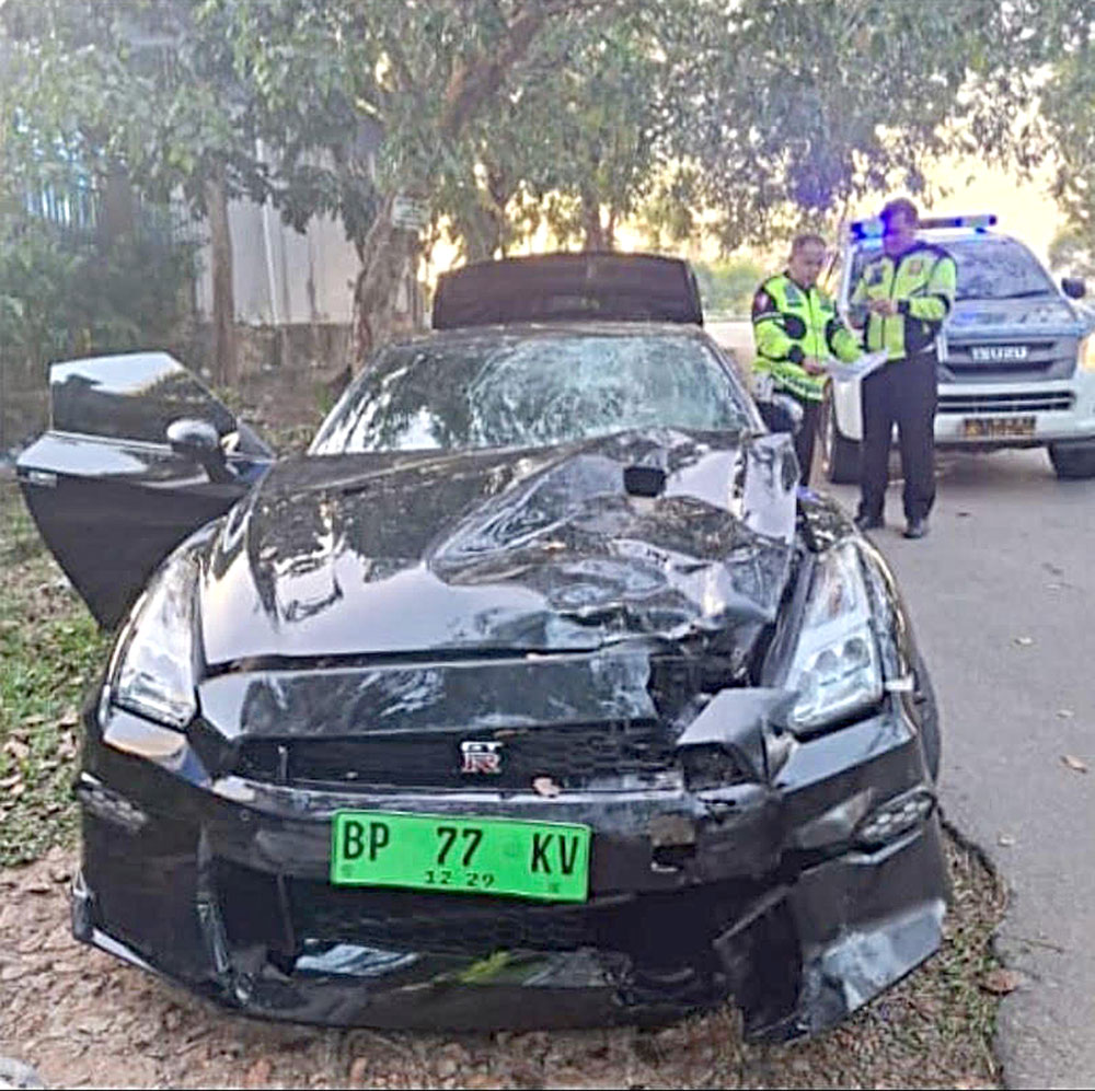 Satu unit mobil mewah Nissan GT-R R35 ringsek usai mengalami kecelakaan di Jalan Ahmad Yani, tepatnya dekat Ruko Anggrek Sari, Batam Kota, Selasa (19/8) sekitar pukul 05.00 WIB. Mobil yang dikendarai BY (19) menabrak pengendara motor dari belakang hingga menewaskan SH (40), karyawan PT JMS Batam. Berita selengkapnya di Halaman 9 Metropolis. F. Yofi Yuhendri/Batam Pos