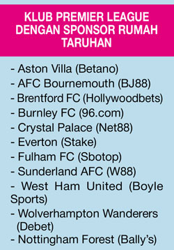 Dianggap sebagai liga paling berharga di dunia, senilai EUR11,77 miliar (Rp222,19 triliun), menurut studi oleh SportingPedia, Premier League lumayan bergantung pada sponsor rumah taruhan. Dari 20 kontestan Premier League, 11 klub disponsori rumah taruhan.