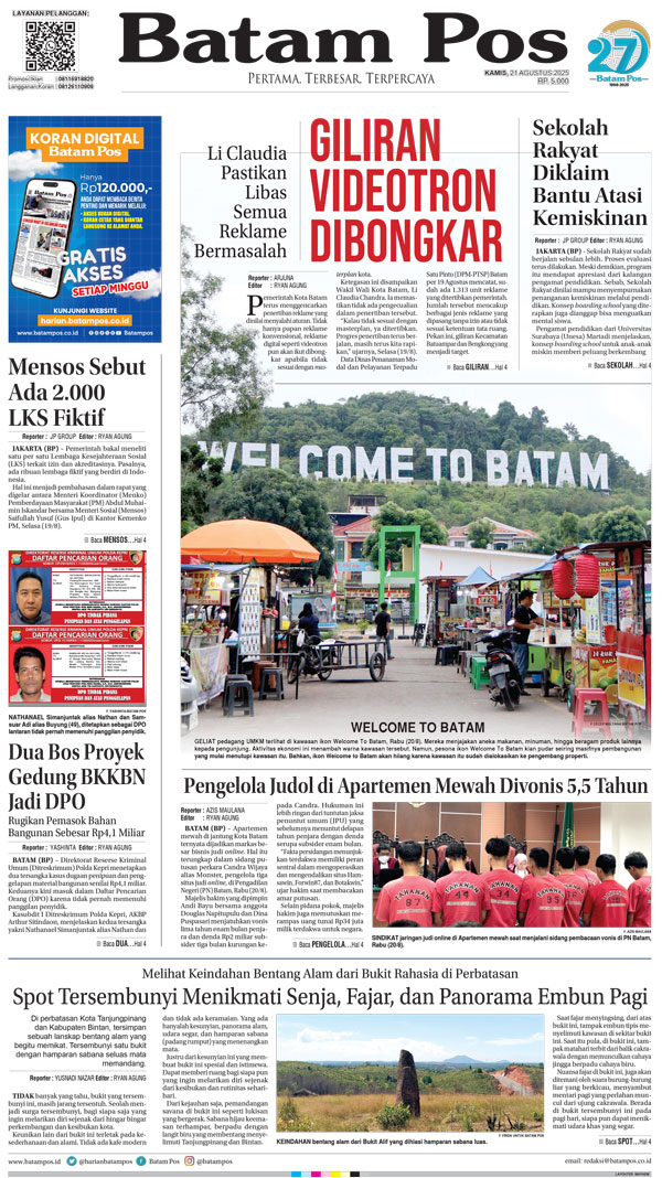 Silakan berlangganan untuk bisa membaca keseluruhan berita di Harian Batam Pos. ﹢ Berlangganan Baca Juga WhatsAppTelegram 21 Agustus 2025 21 Agustus 2025 Buka konten iniDengan mendaftarkan diri Anda di Harian Batam Pos, Anda akan mendapatkan akses penuh ke seluruh konten.SubscribeKami tidak akan mengirimkan email yang tidak berkaitan dengan akun Anda.Saya setuju untuk memperoses data saya sesuai dengan Aturan Layanan yang disediakan.