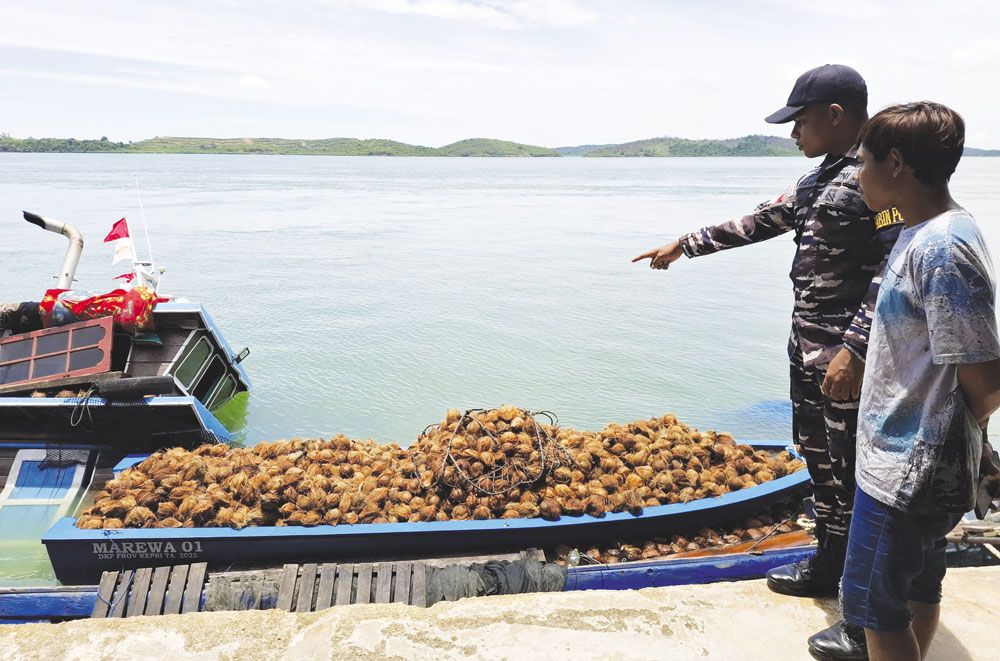 Sebagian muatan kelapa yang berhasil dievakuasi sudah ditepikan ke pelabuhan. Sebagiannya dibungkus karung merah, dan ada pula yang diangkut dengan kapal Marewa 01.