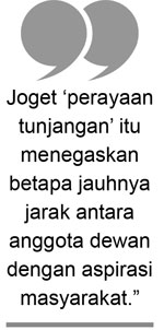 Rakyat kecil dipaksa mengencangkan ikat pinggang, sedangkan para wakilnya menari di atas penderitaan yang mereka wakili. Tindakan itu tidak saja menyakitkan, tetapi juga memperkuat jurang psikologis yang kian menganga antara elite dan rakyat. Potret buruk semacam itu memperpanjang daftar kelakuan anggota dewan yang sering mencoreng citra lembaga legislatif.