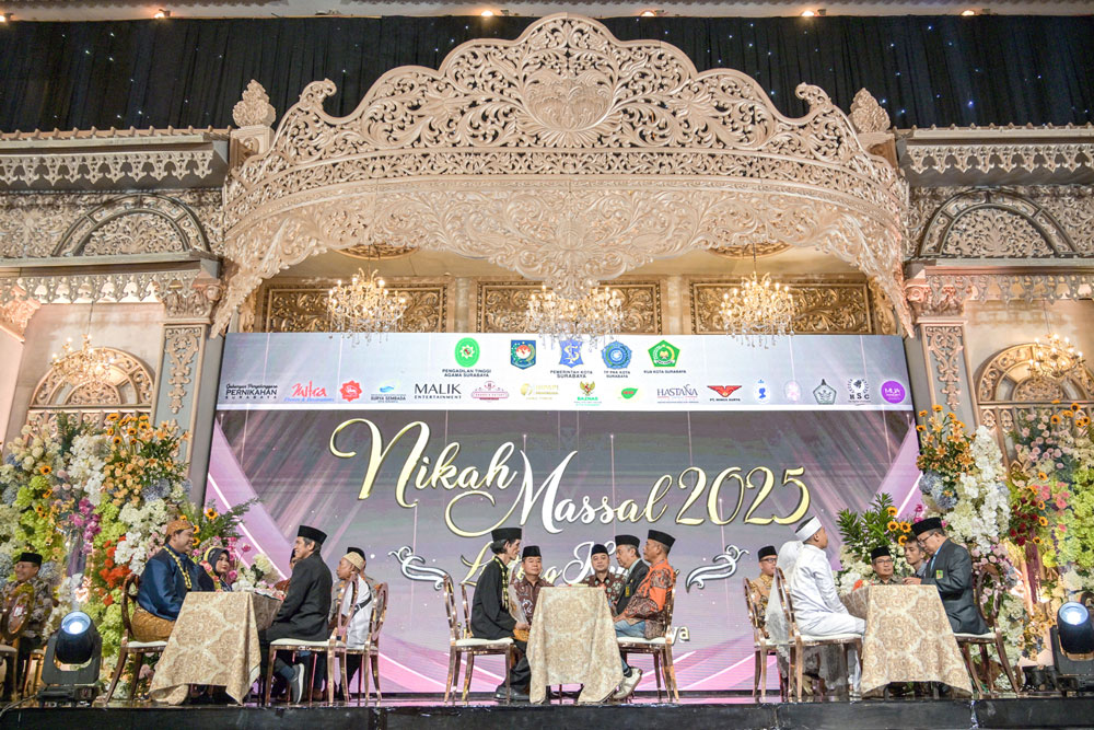 Para calon pengantin mengikuti penikahan massal yang digelar Pemerintah Kota Surabaya untuk puluhan pasangan yang sebelumnya menikah secara adat namun belum tercatat secara hukum, di Surabaya, Rabu (27/8). Acara serupa akan digelar di Kota Batam pada 30 Oktober mendatang dengan target 100 pasangan (Baca Halaman Metropolis). Foto-foto: Juni KRISWANTO/AFP