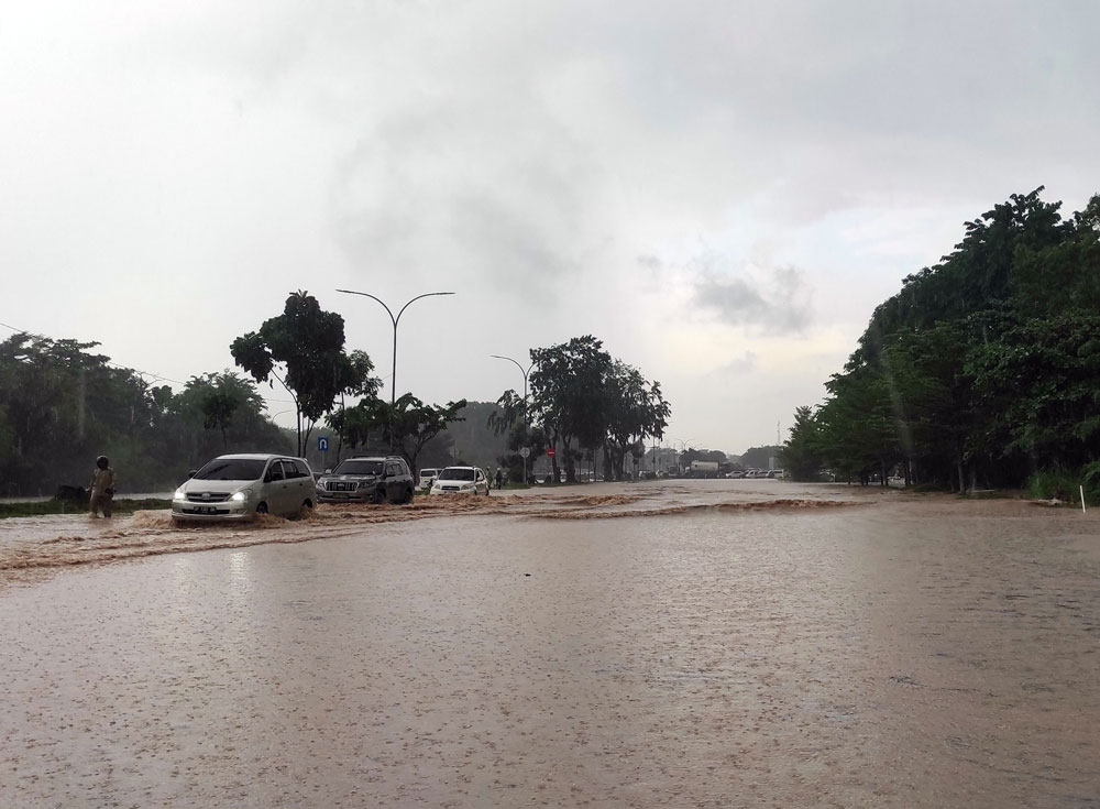 Hujan deras pada hari yang sama turut memperburuk kondisi lalu lintas dengan genangan setinggi lutut di Simpang Kepri Mall, menyebabkan sejumlah motor mogok.
