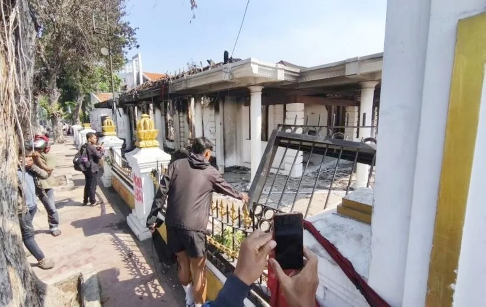 Kelompok massa tidak hanya menyasar petugas. Mereka juga melempari Gedung Negara Grahadi di Surabaya dengan batu, petasan, dan bom molotov. Gerbang sisi barat bangunan cagar budaya dijebol. Massa masuk dan langsung membakar atap gedung hingga ludes.