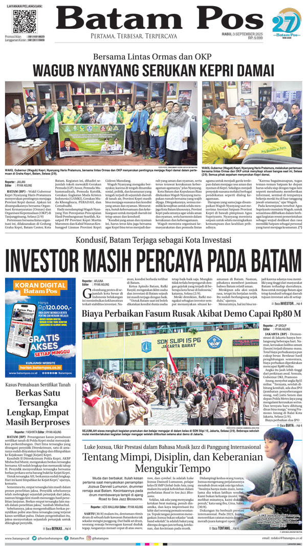 Silakan berlangganan untuk bisa membaca keseluruhan berita di Harian Batam Pos. ﹢ Berlangganan Baca Juga 14 Februari 2026 14 Februari 2026 WhatsAppTelegram 3 September 2025 3 September 2025 Buka konten iniDengan mendaftarkan diri Anda di Harian Batam Pos, Anda akan mendapatkan akses penuh ke seluruh konten.SubscribeKami tidak akan mengirimkan email yang tidak berkaitan dengan akun Anda.Saya setuju untuk memperoses data saya sesuai dengan Aturan Layanan yang disediakan.