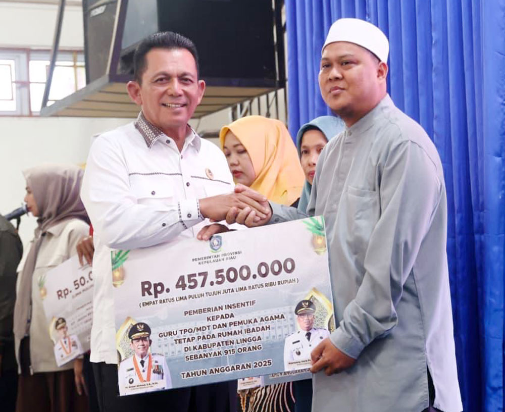 Bantuan insentif keagamaan sebesar Rp457,5 juta untuk 915 orang, yang terdiri dari 601 guru pendidikan keagamaan non formal (TPQ/MDT), 48 penyuluh agama non-PNS, dan 266 pemuka agama. Bantuan rumah ibadah total Rp2,41 miliar untuk 33 penerima di Kabupaten Lingga.
