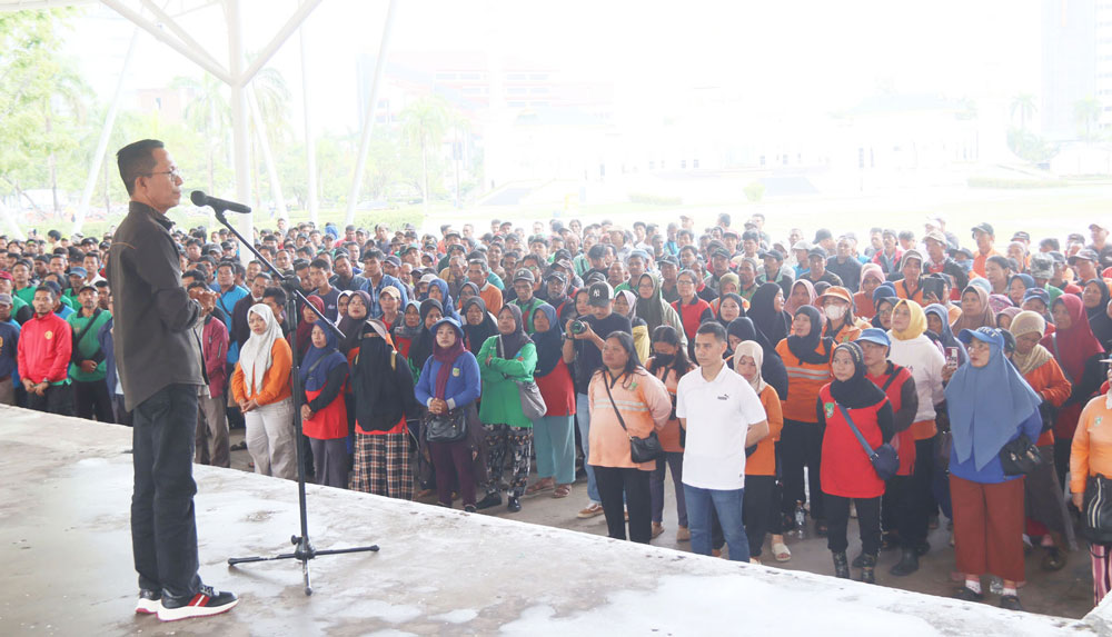 BATAM KOTA (BP) – Wali Kota Batam, Amsakar Achmad, mengumpulkan 906 petugas kebersihan dalam apel besar di Alun-Alun Engku Putri, Minggu (7/9). Apel ini diikuti petugas retribusi, sopir pengangkut, hingga penyapu jalan yang setiap hari menjadi garda terdepan menjaga kebersihan kota.