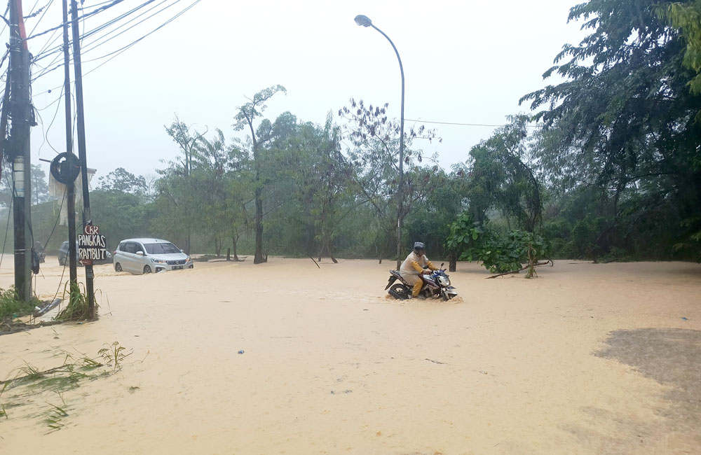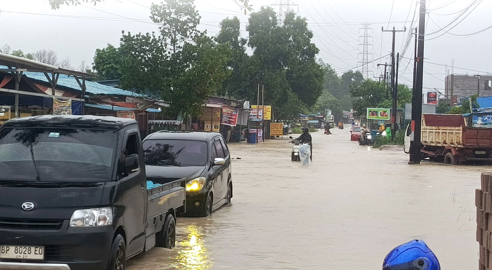 Sejumlah kendaraan terjebak banjir di Marina City, Selasa (9/9). Tidak hanya jalan raya, banjir kali ini juga masuk ke pemukiman warga, sejumlah rumah dilaporkan tergenang air. Berita selengkapnya di Halaman 9 Metropolis. Foto-foto: Eusebius Sara/Batam PosSejumlah pengemudi kendaraan bermotor mencoba menerobos tingginya genangan air di Marina City.