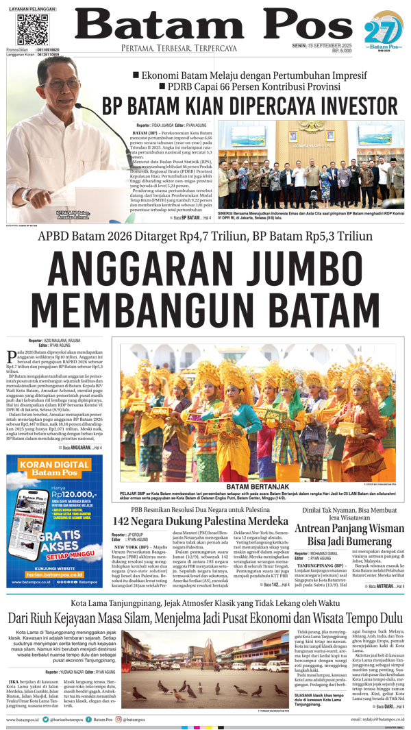 Silakan berlangganan untuk bisa membaca keseluruhan berita di Harian Batam Pos. ﹢ Berlangganan Baca Juga WhatsAppTelegram 15 September 2025 15 September 2025 Buka konten iniDengan mendaftarkan diri Anda di Harian Batam Pos, Anda akan mendapatkan akses penuh ke seluruh konten.SubscribeKami tidak akan mengirimkan email yang tidak berkaitan dengan akun Anda.Saya setuju untuk memperoses data saya sesuai dengan Aturan Layanan yang disediakan.