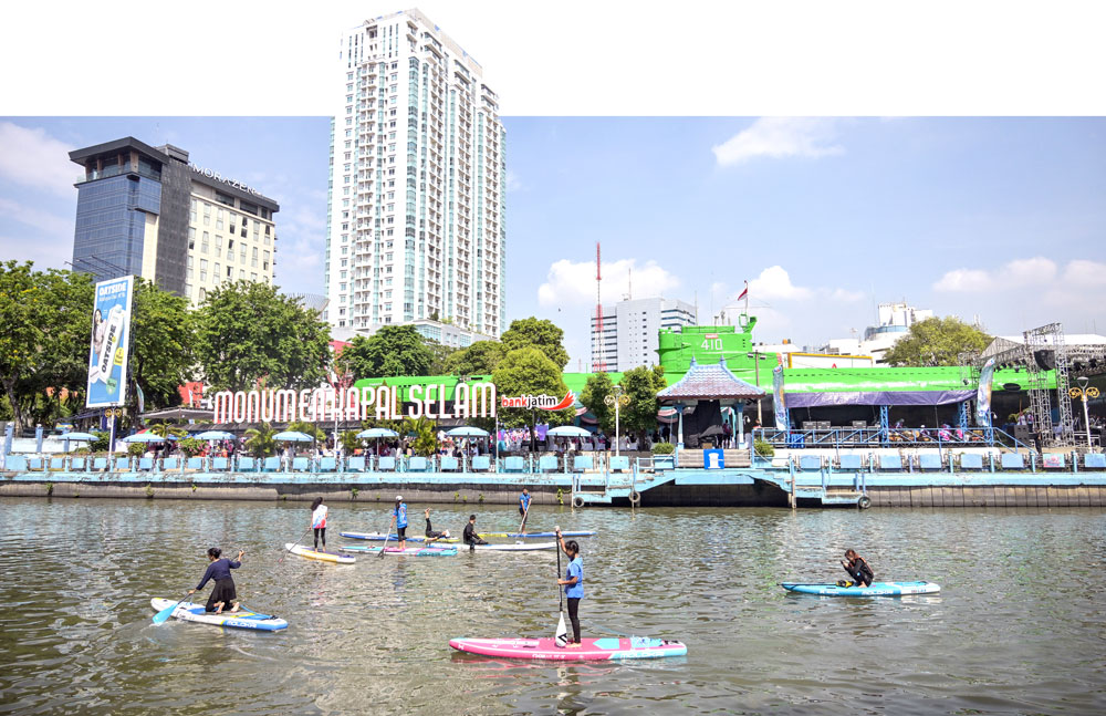 Orang-orang mendayung papan dayung berdiri di sungai Surabaya, Minggu (14/9). Wisata air menjadi salah satu jenis pariwisata yang digesa Pemerintah Kota Surabaya. Foto. Juni KRISWANTO/AFP