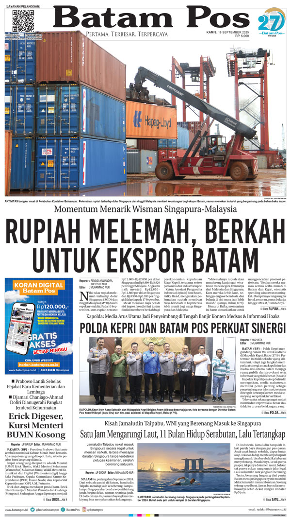 Silakan berlangganan untuk bisa membaca keseluruhan berita di Harian Batam Pos. ﹢ Berlangganan Baca Juga 4 April 2026 4 April 2026 WhatsAppTelegram 18 September 2025 18 September 2025 Buka konten iniDengan mendaftarkan diri Anda di Harian Batam Pos, Anda akan mendapatkan akses penuh ke seluruh konten.SubscribeKami tidak akan mengirimkan email yang tidak berkaitan dengan akun Anda.Saya setuju untuk memperoses data saya sesuai dengan Aturan Layanan yang disediakan.