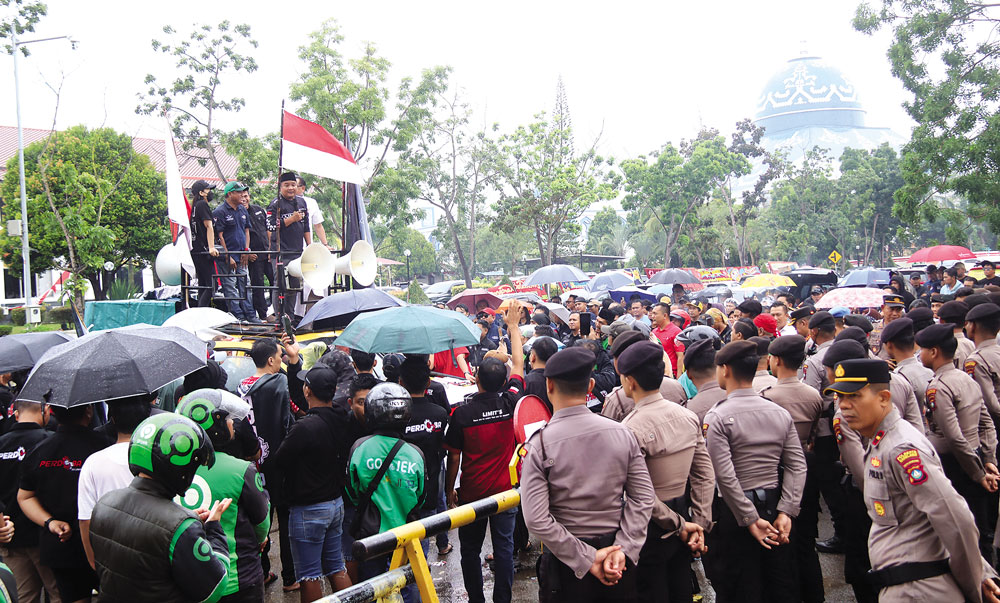 Driver Online melakukan unjuk rasa di depan kantor Walikota Batam, Rabu (17/9). Mereka menuntut penyesuaian tarif, pemotongan aplikasi dan tuntutan lainnya. Foto. Cecep Mulyana/Batam Pos