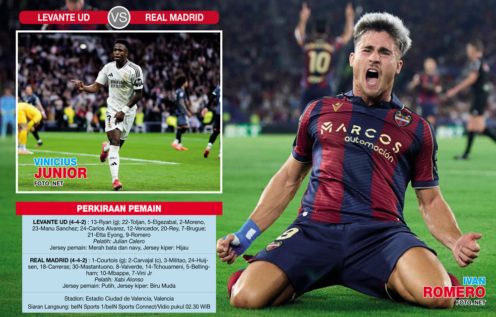 Ketika Real memainkan jornada keenam di kandang Levante UD, Estadio Ciudad de Valencia, dini hari nanti(siaran langsung beIN Sports 1/beIN Sports Connect/Vidio pukul 02.30 WIB), sinyal Vini tetap disubstitusi tetap terbuka. Itu karena Xabi bukan hanya memilikirkan tetap melanjutkan sapu bersih kemenangan keenam. Pelatih berjuluk La Barba Roja (Si Janggut Merah) tersebut juga menatap El Derbi Madrileno lawan Atletico Madrid pada Sabtu (27/9).