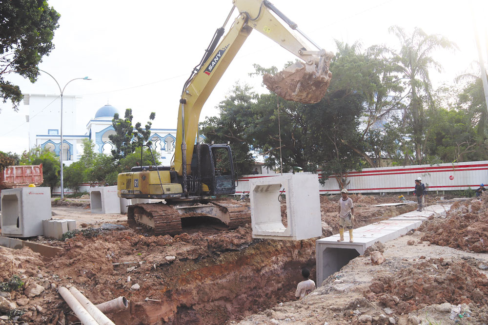 Pekerja memasang gorong-gorong di Jalan Engku Putri, Batam Center, tepatnya di samping kantor DPRD Batam dan Masjid Agung Raja Hamidah, Senin (29/9). Pemasangan ini diharapkan dapat mengurangi banjir yang kerap melanda kawasan tersebut. Foto: Cecep Mulyana/Batam Pos