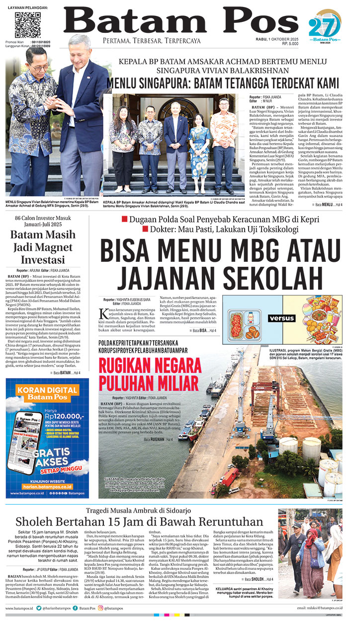 Silakan berlangganan untuk bisa membaca keseluruhan berita di Harian Batam Pos. ﹢ Berlangganan Baca Juga WhatsAppTelegram 1 Oktober 2025 1 Oktober 2025 Buka konten iniDengan mendaftarkan diri Anda di Harian Batam Pos, Anda akan mendapatkan akses penuh ke seluruh konten.SubscribeKami tidak akan mengirimkan email yang tidak berkaitan dengan akun Anda.Saya setuju untuk memperoses data saya sesuai dengan Aturan Layanan yang disediakan.