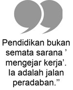 Dalam kerangka tersebut, alih-alih hanya menjadi ruang sempit untuk memindahkan pengetahuan, pendidikan adalah jalan untuk membentuk peradaban (civilization) bangsa Indonesia seutuhnya. Nahasnya, belakangan ini, makna luhur itu semakin tergerus dalam pusaran pragmatisme.