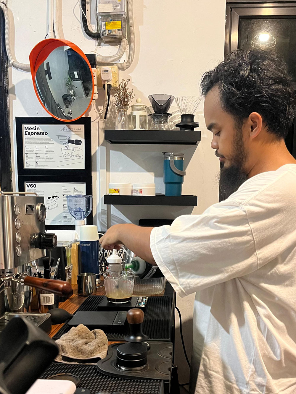 “Awalnya saya coba bikin kopi dari merek lokal, seperti kopi tubruk. Setelah ada sedikit rezeki, pelan-pelan saya beli alat espresso, grinder, dan perlengkapan lainnya,” tutur Ismet.